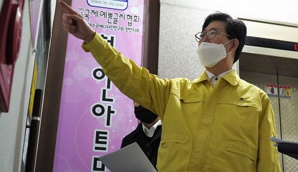 충남도내 코로나19 확진자 급증 추세로 도민 불안감이 커지고 있는 가운데, 양승조 지사가 신천지 관련 시설을 불시 점검했다.