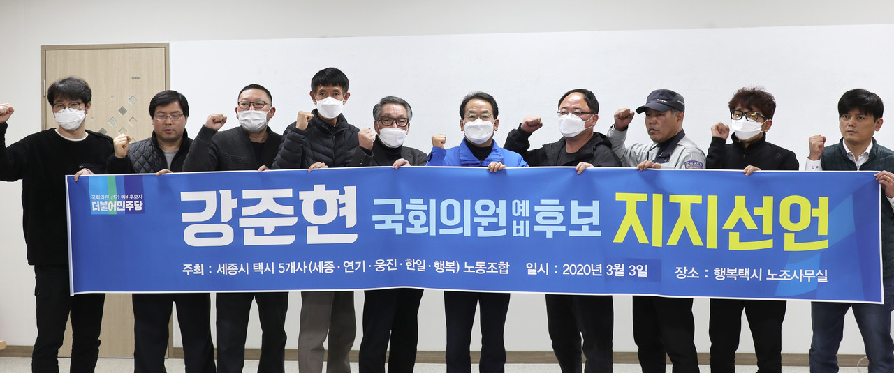 세종시 5개사(세종?연기?웅진?한일?행복) 법인 택시노조에 따르면 250여 명의 택시노조 조합원들은 간부회의를 통해 강준현 예비후보에 대한 공개지지에 합의하고, 강 예비후보의 당선을 위해 적극 노력할 것을 결의했다.