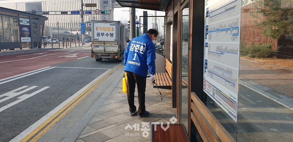 강준현 더불어민주당 세종시 국회의원 예비후보는 코로나19 사태의 조기 극복을 위해 선거운동 일환인 아침인사 대신 공공시설 방역 및 소독작업에 나섰다.