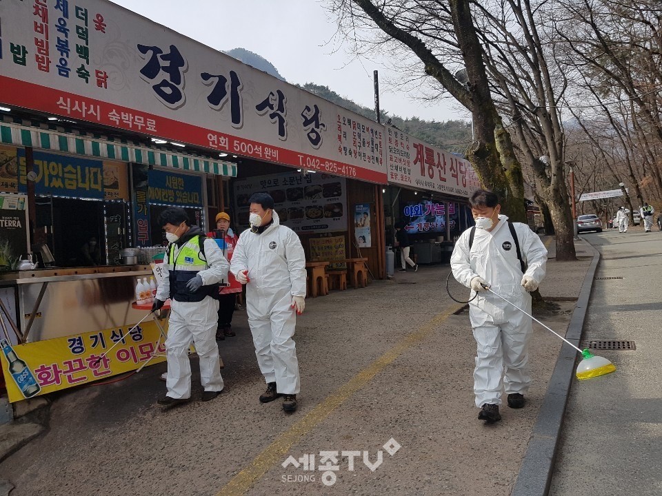 공주시 동학사 인근 상가 및 주민들이 코로나19 예방을 위해 자체 방역활동을 지난 9일 실시했다.