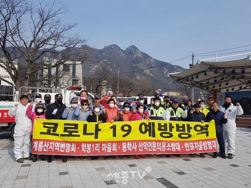 반포면 학봉1리 마을회와 계룡산동학사 상가번영회 등 60여명은 이날 코로나19 예방은 물론 상권 활성화를 위해 동학사 일대 상가와 인근 마을 중심으로 방역 소독을 실시했다.