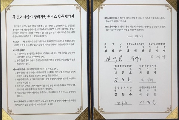 홍성군은 무연고사망자의 공영 장례서비스를 지원하기 위해‘무연고 사망자 장례지원 서비스 협약’을 체결했다고 9일 밝혔다.