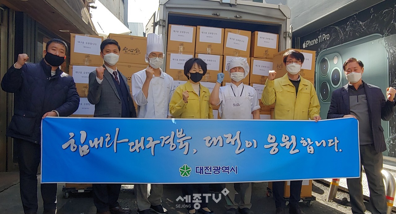 대전시는 12일 코로나19 극복을 위해 불철주야 헌신하고 있는 대구경북 공직자들에게 격려와 응원의 마음을 담은 성심당 튀김 소보로 3,500개를 전달했다. 저작권자 © SJB세종TV 무단전재 및 재배포 금지 세종TV 다른기사 보기 페이스북 트위터 카카오톡 네이버블로그 구글+ URL복사 기사공유하기