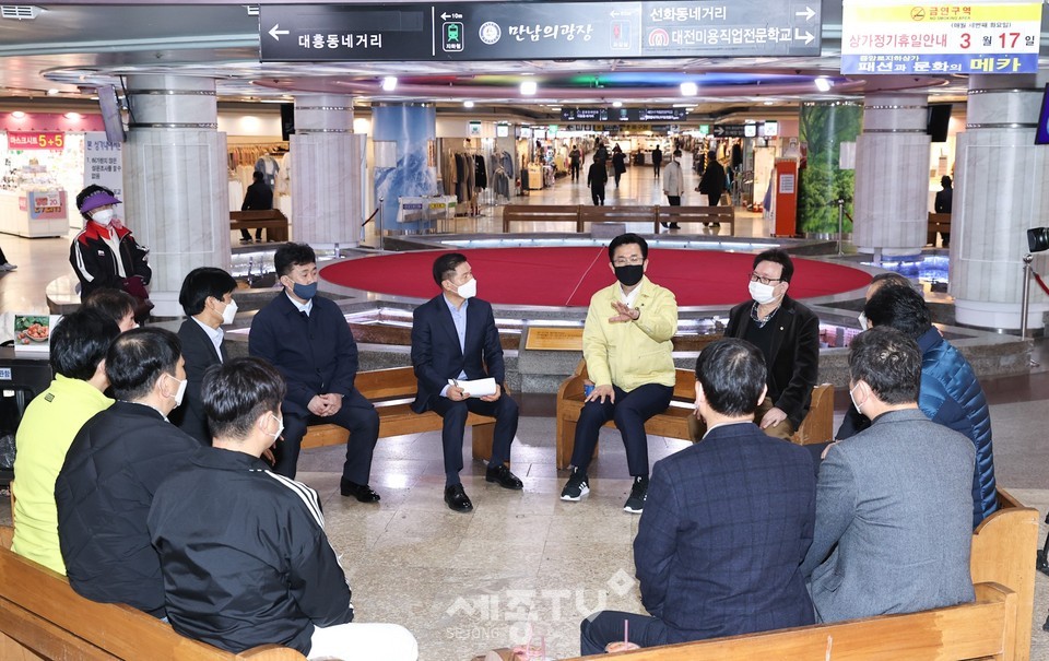 이어 허태정 시장은 중앙로 지하상가 만남의 광장에서 소상공인들과 간담회를 갖고 상인들의 애로사항을 듣고 격려했다.