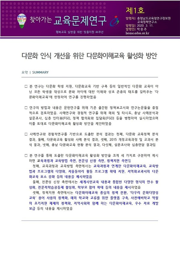 충남교육청(교육감 김지철) 교육정책연구소는 ‘찾아가는 교육문제연구’ 제1호를 11일 발간하였다. 이번 호는 일반적인 다문화 교육이 아닌 ‘모든 학생을 대상으로 문화 차이에 대한 이해와 상호 존중의 태도를 길러주는’ 다문화 이해교육 자료이다.