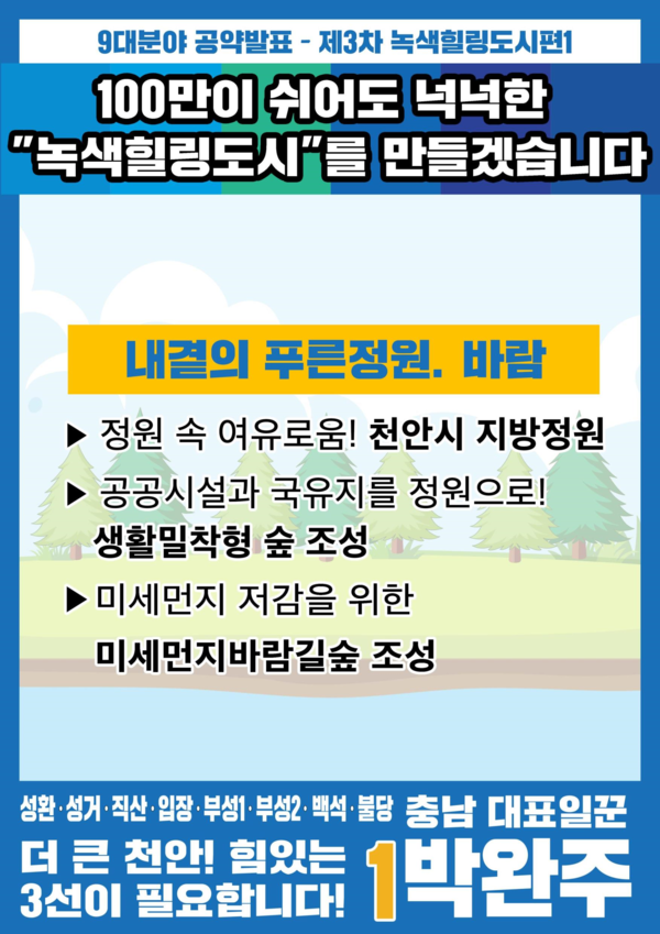 박완주 의원은 제3차 공약발표회에서 가장 먼저 <내 곁의 푸른 정원, 바람>을 주제로 “천안의 품격을 높이고 시민의 건강을 지키겠다”며 ▲역사와 자연이 접목된 천안시 지방정원 조성 ▲공공시설과 국유지를 정원으로 조성하는 생활밀착형 숲 조성 ▲미세먼지 차단을 위한 도시 바람길숲 조성 등 3가지를 약속했다.