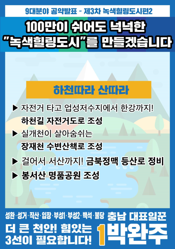 박완주 국회의원(천안을 · 더불어민주당 후보)은 3월 10일 제2차 공약발표회 “사통팔달도시 천안 편”에 이어 3월 14일 제3차 공약발표회를 열고 “녹색힐링도시 천안”을 위한 3대 분야 11가지 로드맵을 제시했다.
