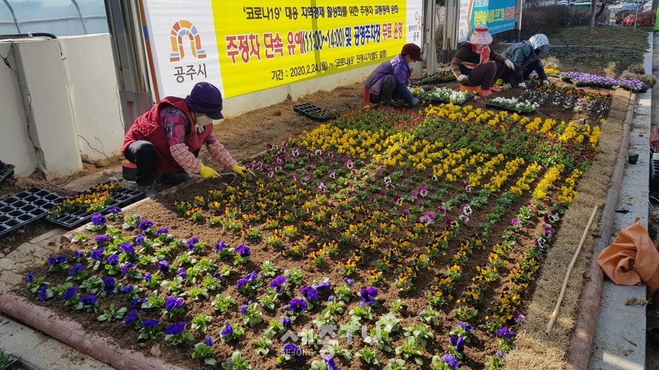 공주시 신관동은 지난 16일 행정복지센터 앞 화단과 가로 화분에 팬지와 비올라, 데이지 등 봄꽃 2만 본을 식재했다.