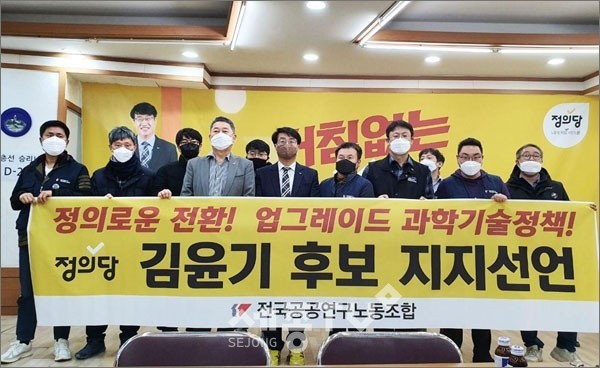 과학기술계와 경제인문사회연구회 정부출연 연구기관, 카이스트를 포함한 과학기술 특성화 대학, 시험인증기관, 테크노파크, 지자체 출연출자기관, 전문생산기술연구소 등 120개 공공연구기관 노동자 1만 3천명으로 구성된 공공연구 노동조합이 유성을 김윤기 후보 지지를 선언했다.