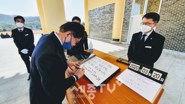 황운하 후보는 방명록에 “호국영령의 숭고한 뜻을 이어받아 정치개혁, 중구 부흥을 이루겠습니다”라고 적었다.