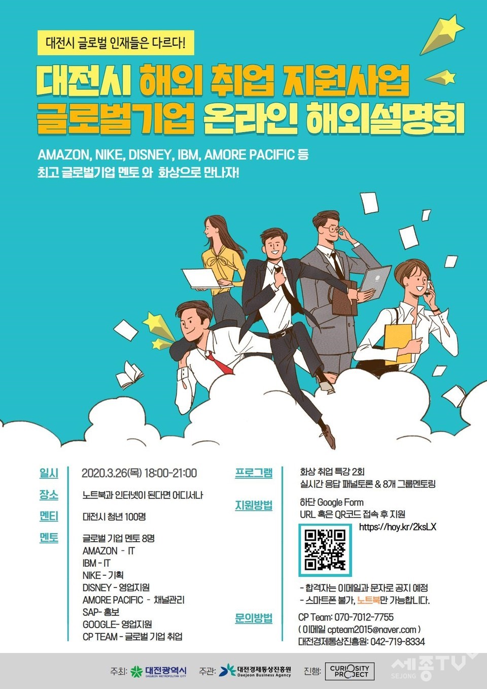 설명회에는 아마존, 아모레퍼시픽, 나이키, 구글 등 글로벌 기업의 전·현직자들이 멘토로 참여해 글로벌 기업 소개, 해외취업 트랜드, 직무분석 등 각종 취업정보를 제공하고 화상채팅을 통해 현직자와 구직자 사이에 자유로운 질의답변 상담도 진행한다.