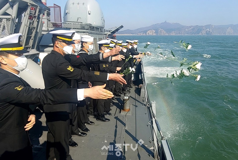 천안함 46용사 10주기 추모행사를 앞두고 군(軍)이 ‘안보결의 주간’을 운영 중인 가운데, 3월 23일 백령도 천안함 위령탑 인근 해상에서 해군 2함대 황도현함(PKG, 400톤급) 장병들이 천안함 용사들을 추모하며 해상헌화를 하고 있다. 황도현함은 유도탄고속함으로 제2연평해전 전사자인 황도현 중사의 이름을 함명으로 사용했으며 2015년부터 2함대에 예속되어 서해수호 임무를 수행 중이다.