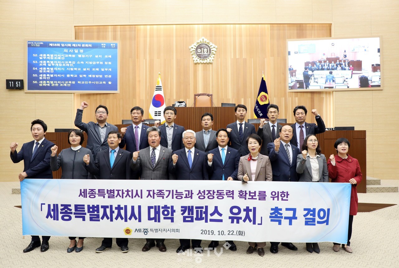 이날 세종시의회는 상병헌 의원이 대표 발의하고 의원 전원(17명)이 참여한 ‘세종특별자치시의회 대학캠퍼스 유치 특별위원회 결의안’을 가결했으며, 상병헌, 안찬영, 이태환, 차성호, 박성수 의원 5명을 특위 위원으로 선임했다.