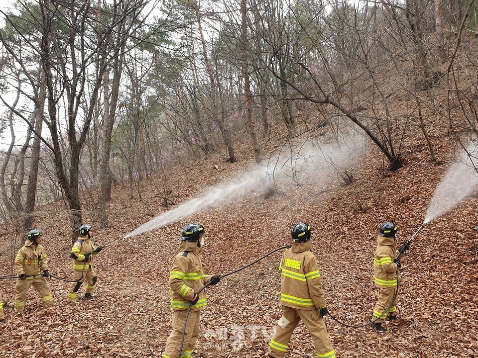 이번 훈련은 ▲ 산불 발생 시 인근의 시설물과 인명보호에 대한 최우선 대응 ▲ 산불진화용 호스릴이 장착된 소방펌프차의 전술적 배치와 입체적 운용 ▲ 산불 진행 상황별 추가 인력과 장비 투입 ▲ 의용소방대원 비상소집 및 동원자원에 대한 적절한 임무 부여 등에 중점을 두고 실시됐다.