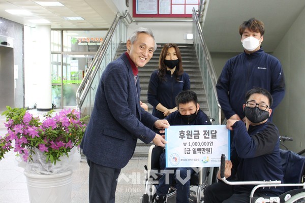 충청남도장애인체육회 소속 보치아 실업팀(감독 임광택)이 26일 천안시노인종합복지관(관장 김영운)에서 취약계층 노인을 위한 코로나19 방역물품 지원을 위한 후원금 전달식을 진행했다.