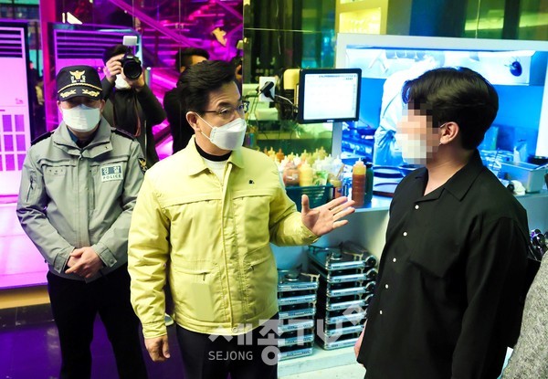 허태정 시장은 둔산동 일대의 주점을 돌아다니며 마스크 착용, 출입자 발열체크, 시설 소독 등 방역지침 준수 여부를 일일이 점검하고, 사회적 거리두기에 적극 동참해 줄 것을 당부했다.