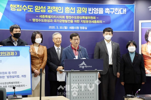 세종특별자치시의회 행정수도완성특별위원회(위원장 채평석, 이하 행정수도특위)와 ‘행정수도완성과 국가균형발전을 위한 지방분권세종회의(상임대표 김준식, 이하 지방분권세종회의)’는 30일 세종시청 정음실에서 ‘행정수도 완성 정책, 총선 공약 반영 촉구 성명서’를 발표했다.
