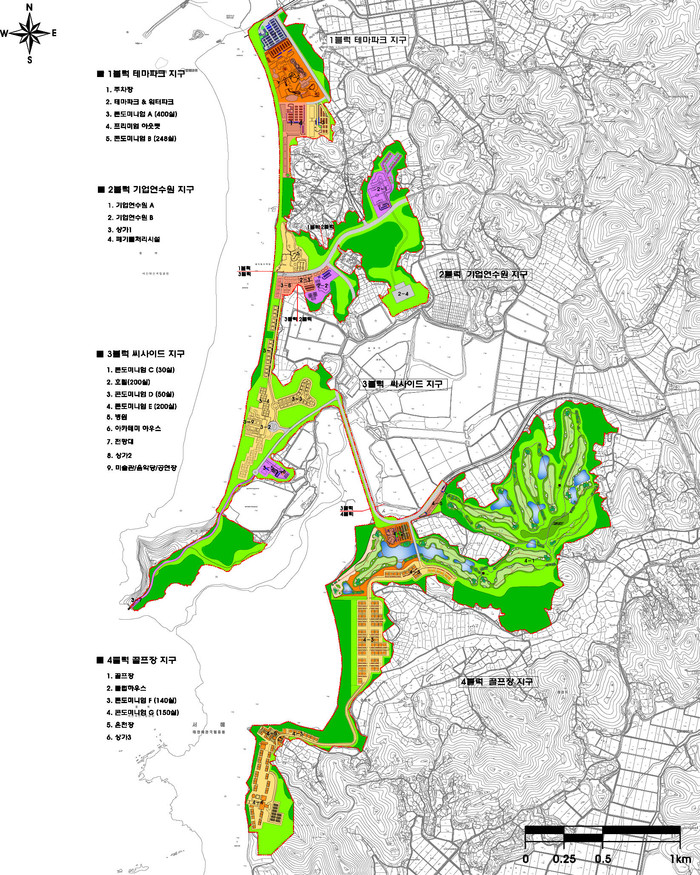 내년부터 2016년까지 1단계에는 전체 면적의 72%를 골프장지구와 씨사이드지구로 개발하고, 2017∼2018년 2단계에는 기업연수원지구 개발을, 2019∼2020년 3단계는 테마파크지구 개발을 추진한다.