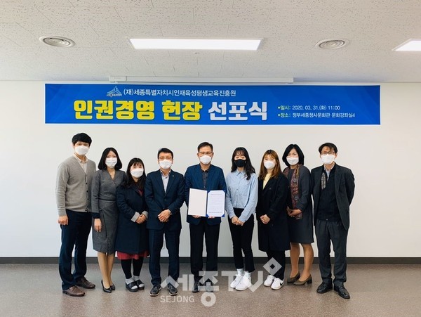 (재)세종특별자치시인재육성평생교육진흥원(원장 임각철)은 31일 정부세종청사문화관 문화강좌실에서 노사가 함께하는 인권경영 헌장 선포식을 갖고 ‘차별없는 세상, 사람이 존중받는 조직문화 정착’을 다짐했다.