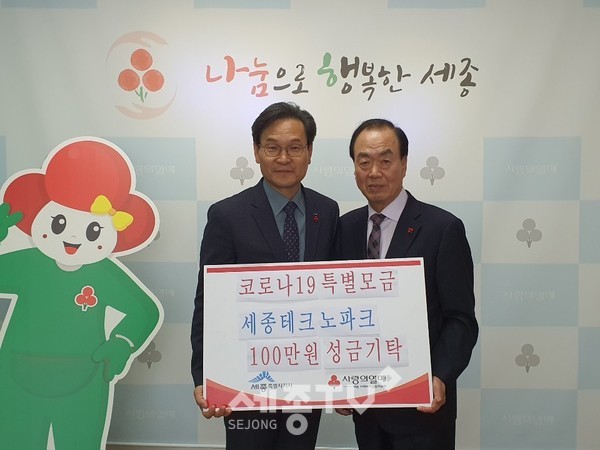 세종테크노파크는 31일 지역사회의 코로나19 확산에 따른 경제적 어려움을 조기 극복하기 위해 성금 100만원을 세종사회복지공동모금회에 전달했다. 성금은 지역주민과 소상공인의 경제적 어려움을 극복하기 위해 전 임직원이 자율적으로 모금하였다.