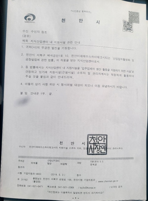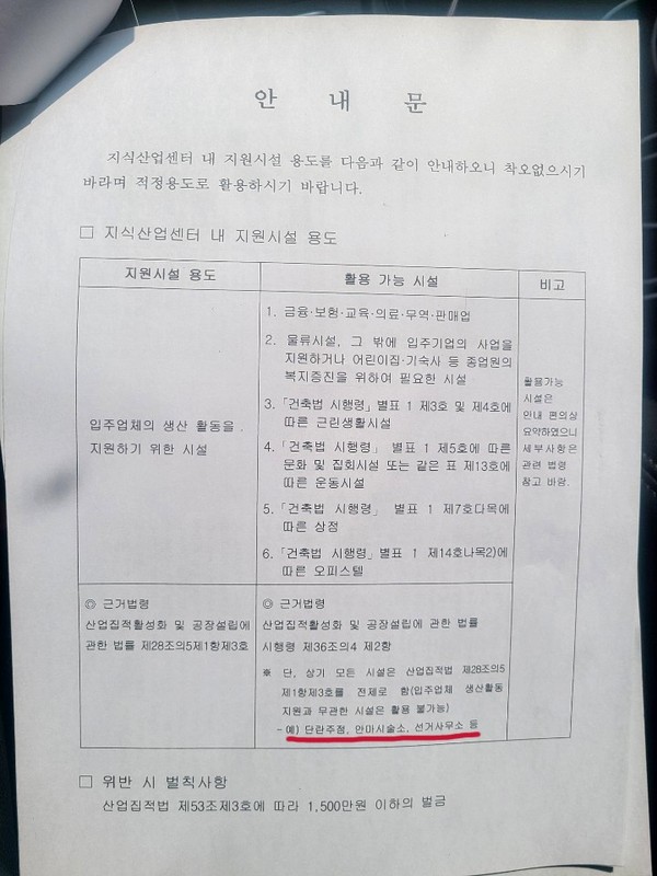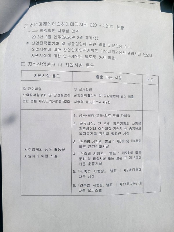 또한, 안내문 근거법령으로 산업집적할성화 및 공장설립에 관한 법률 시행령 제36조의 4 제2항은 생산활동을 지원하기 위해 휴게음식점, 제과점 이용원 등을 입주 시킬 수 있다는 것이지만 천안시는 단, 상기 모든 시설을 산업집적법 제28조의5 제1항 제3호을 전제로 함(임부업체 생산 활동 지원과 무관한 시설은 활용 불가능)이라면서 예) 단란주점,안마시술소,선거사무소 등을 명시하고 있다.