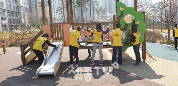 특히, 어린이들이 자주 이용하는 놀이터 시설과 여러 시민들이 사용하는 어울링 자전거, 계단 난간 등 평소 방역소독의 손이 닿기 어려운 부분까지 집중적으로 소독했다.