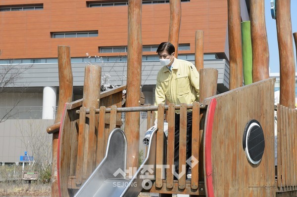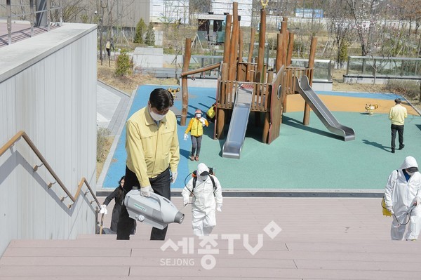 이춘희 시장도 이날 주민자치위원회와 함께 보람동주민센터 주변 공원 등지에서 방역소독기를 사용해 방역활동에 동참했다.