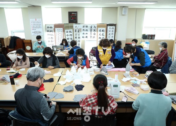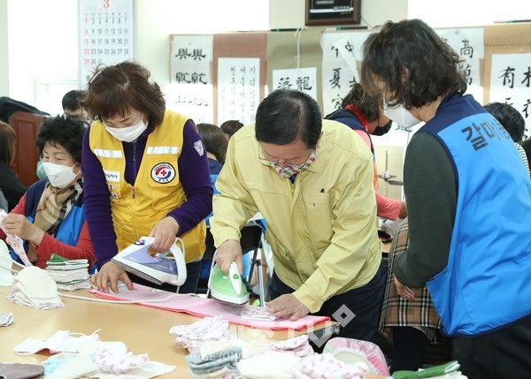 먼저 자생단체연합회원 100여명은 주민자치회 후원으로 지난달 19일부터 26일까지 갈마1동 행정복지센터 2층 다목적실에서 주말, 휴일을 반납한채 밤늦게까지 친환경 면 마스크 제작에 나섰다.