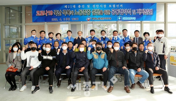 한국노총 천안지부는 2일(목) 문진석 천안갑 후보와 ‘코로나 19 국난극복과 노동존중 실천 협약’을 체결하고, 문 후보를 지지한다는 입장을 밝혔다.