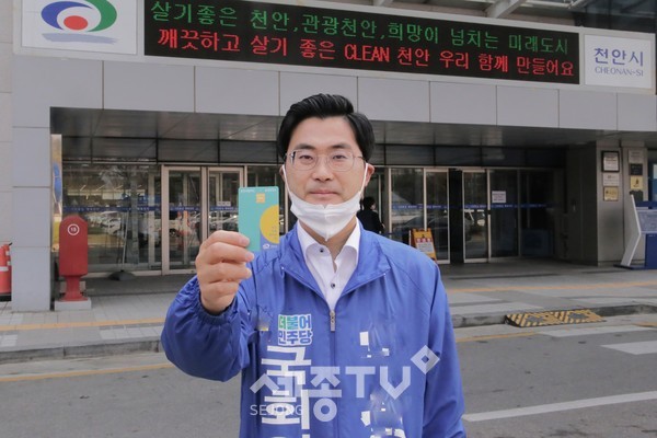 이정문 더불어민주당 천안(병) 국회의원 후보는 오늘(7일) 오후, 천안시청 내 농협지점에서 천안사랑카드를 신청했다고 밝혔다.