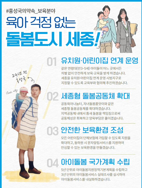 홍 후보는 “돌봄 문제는 어느 한 가족만의 일이 아니라 우리 사회, 국가가 함께 책임져야 할 일”이라면서 “전국에서 가장 젊은 도시인 세종이 보육 정책에서도 전국 1등이 될 수 있도록 최선을 다하겠다”고 말했다.