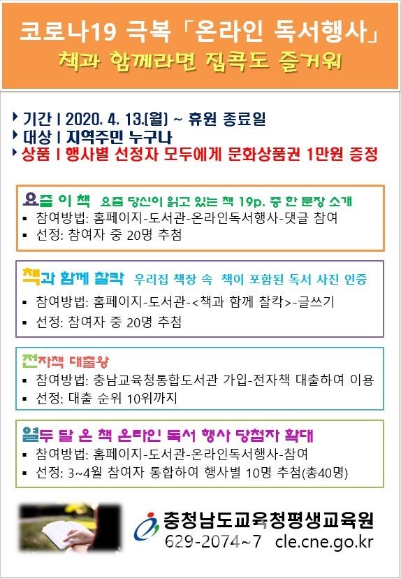 충청남도교육청평생교육원(원장 박순옥)은 ‘코로나19’로 인한 임시휴원이 길어짐에 따라 지역주민의 가정내 독서활동을 지원하기 위한 다양한 <온라인 독서행사>를 4월 13일(월)부터 운영한다.