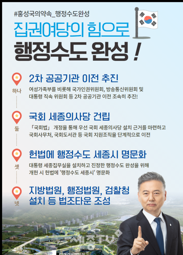 더불어민주당 홍성국 후보(세종갑)가 지체 없이 빠르게 행정수도를 완성하겠다는 의지를 내비쳤다.