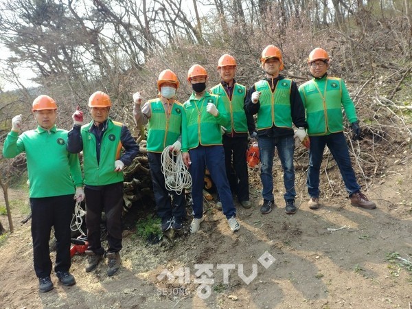 박정환 방재단장과 단원 6명은 주택과 도로변 등 안전사고 위험이 있는 위험목을 찾아 제거하며 구슬땀을 흘렸다.