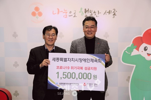 세종특별자치시장애인체육회가 14일 코로나19 극복을 위한 특별성금 150만 원을 사랑의열매 세종사회복지공동모금회에 전달했다.