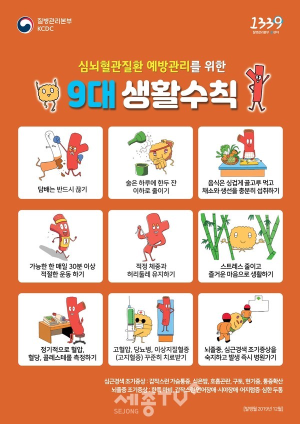 시향숙 건강과장은 “심뇌혈관질환은 우리나라에서 질병부담이 크고 주요한 사망원인 중 하나로, 지속적으로 관리하면 예방이 가능하다”며, “9대 예방수칙을 잘 살펴보시고, 생활습관을 바로 잡아주시길 당부드린다”고 말했다.