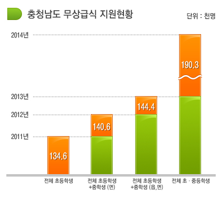 도 관계자는 “대화와 타협을 바탕으로 실시한 무상급식은 충남의 교육복지 수준을 크게 높였다는 점에서 의미가 크며, 특히 지역 내에서 생산된 친환경·우수 농·수·축산물을 학교급식에 사용토록 함으로써 지역 농어업 발전에도 큰 도움이 된 것으로 판단되고 있다”며 “올해 초·중학생 전면 무상급식 실시로 이 같은 효과는 더욱 확대될 것”이라고 말했다.