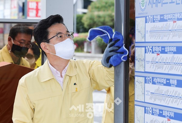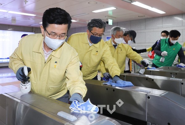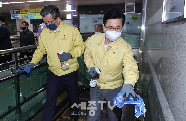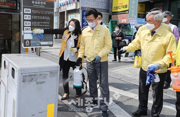 허태정 대전시장은 이 날 유성온천 인근에서 펼쳐진 환경 정화활동에 참여해 유성온천역 내부 소독과 충남대 입구로 이어지는 가로변 환경정비 활동을 함께했다.