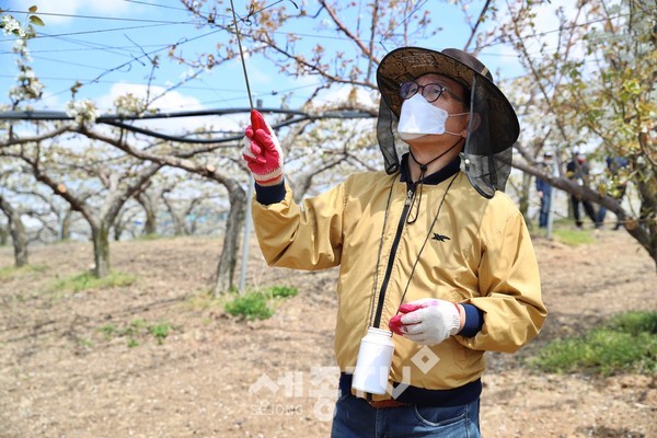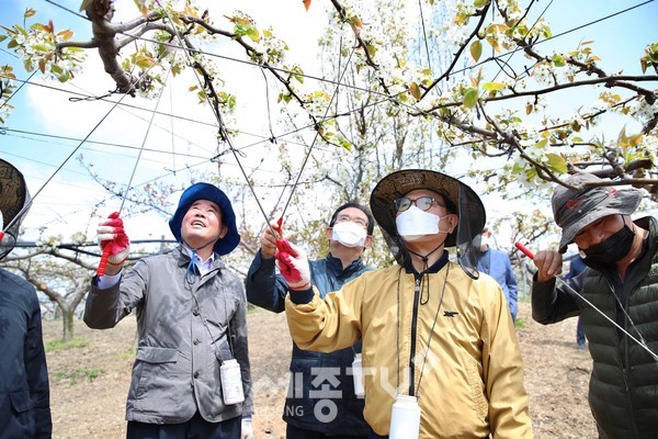 이번 인공수분 일손돕기는 코로나19로 인한 사회적 거리두기 등으로 자원봉사자 수가 급감하는 등 인력수급에 어려움을 겪고 있는 배 재배농가의 시름을 덜어주기 위해 마련됐다.