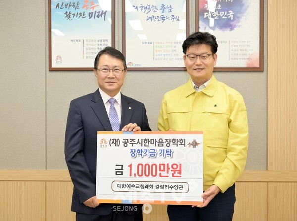 대한예수교 침례회 갈릴리수양관(목사 정태교)은 지난 20일 지역인재 육성을 위해 써달라며 장학기금 1천만 원을 공주시한마음장학회에 전달했다.