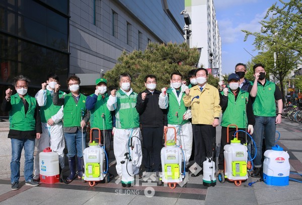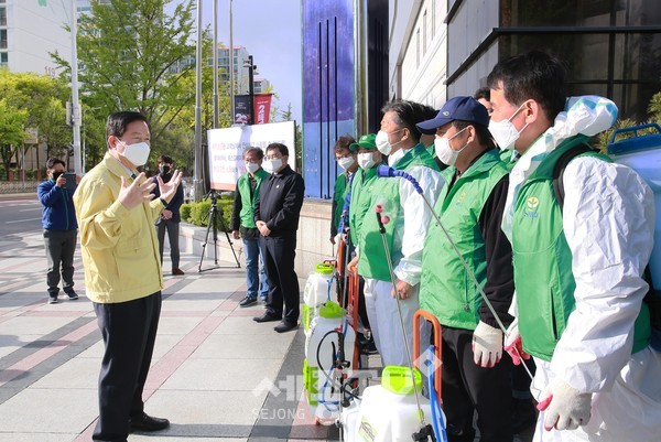 장종태 대전 서구청장은 지난 22일 서구 새마을지도자 회원들로 구성된 ‘새마을 방역단’과 함께 둔산동 세이브존 앞 대로변과 버스승강장, 상가입구 등 유동 인구가 많은 다중공공시설의 방역 소독을 실시했다.