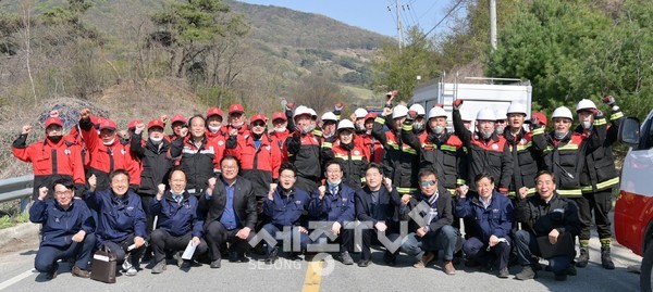 소화시설 점검에 이어 고당고개로 옮겨 산불진화 시연을 참관한 일행은 불철주야 산불예방에 힘써주고 있는 산불감시원과 산불진화대원들을 찾아 노고를 격려하고 애로사항을 청취했다.