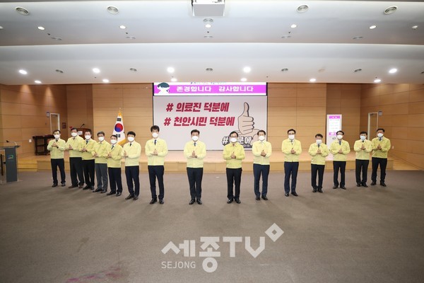 천안시는 박상돈 시장과 간부공무원들이 코로나19 극복을 응원하는 ‘덕분에캠페인’을 진행했다고 밝혔다.