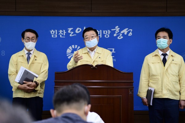 8일 홍성군에서 3개월 만에 3번째 코로나19 확진자가 발생했다. 이날 홍성군수는 긴급 언론 브리핑을 갖고 지난 5일 미국에서 입국한 20대 유학생이 자가격리 중에 확진 판정을 받았다고 밝혔다.