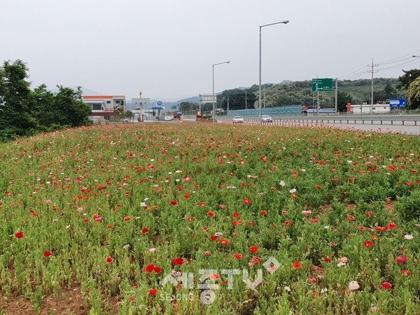 공주시 신풍면 산정리 대로변에 관상용 양귀비 꽃이 만개해 지나가는 사람들의 시선을 끌고 있다.