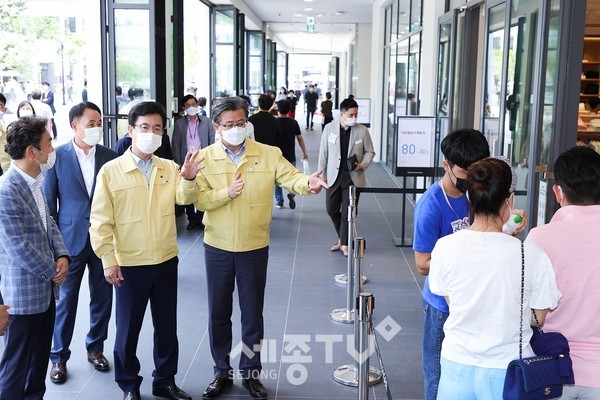 연이은 코로나19 확진자 발생으로 지역사회 감염 확산이 우려되는 가운데 허태정 대전시장이 26일 오전 대전현대아울렛 오픈 현장을 직접 확인하고 나섰다.