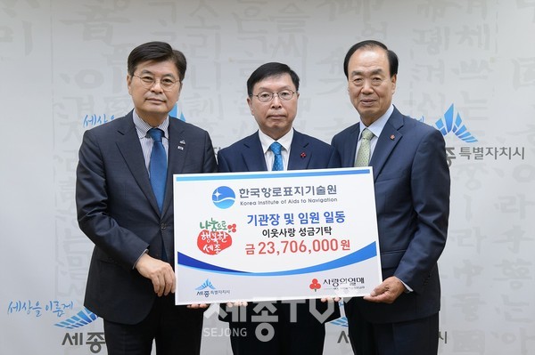 세종특별자치시(시장 이춘희)는 26일 시청 접견실에서 ㈜동원유지 박재필 대표가 2,000만 원, 한국항로표지기술원 박계각 원장과 장옥수·안치국 부원장이 2,370만 6,000원을 기탁했다고 밝혔다.