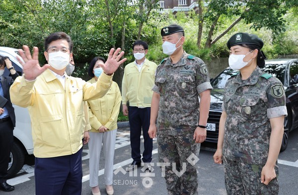 허태정 시장은 이어 천동초등학교 정밀 제독에 나선 국군화생방사령부 시설내부방역팀을 만나 노고에 감사의 뜻을 전하고 철저한 방역을 당부했다.