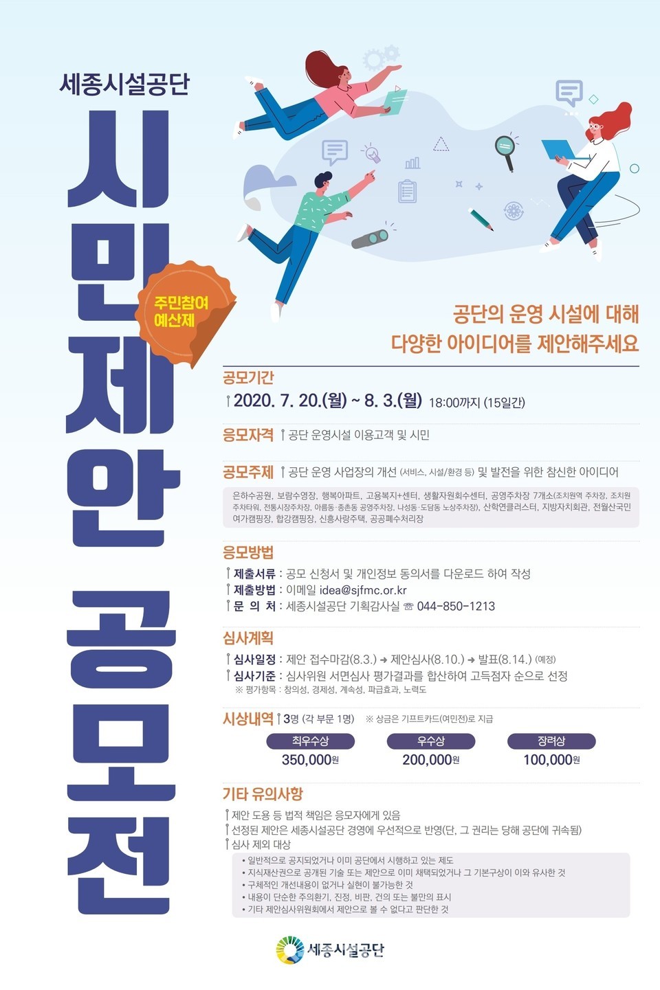 세종특별자치시시설관리공단(이사장 계용준, 이하 공단)은 공단 운영시설의 개선 및 발전을 위해 ‘2020년 시민제안(주민참여 예산제) 공모전’을 개최한다고 20일 밝혔다.