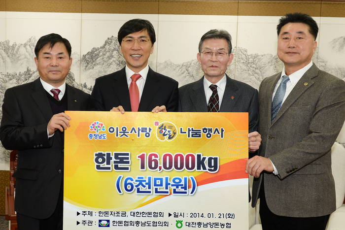 21일 충남도에 따르면, (사)한돈협회 충남도협의회(회장 배상종)와 대전충남양돈농협(조합장 이제만)은 21일 도청 접견실에서 안희정 지사 등이 참석한 가운데, 1만 6000㎏의 돼지고기(6000만 원 상당) 기탁 증서를 사회복지공동모금회 충남도지회에 전달했다.